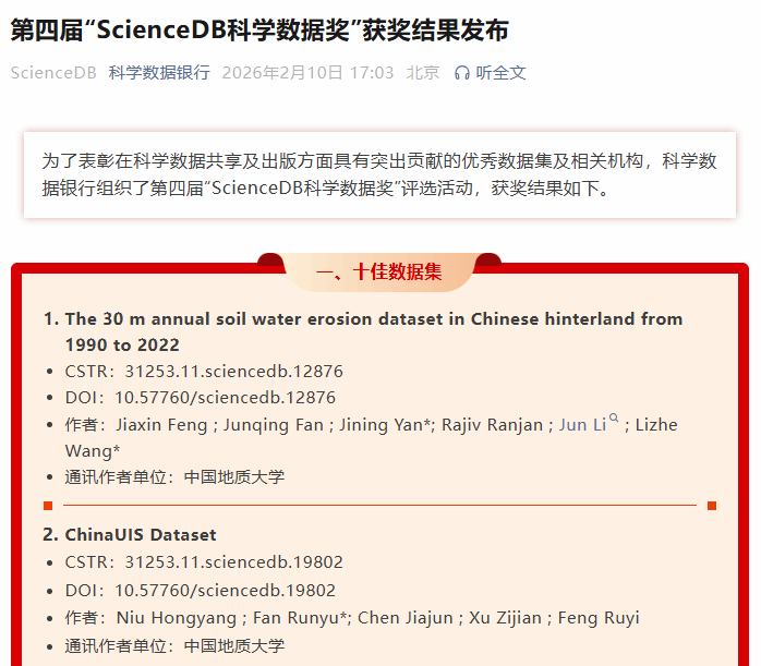 近日,科学数据银行(ScienceDB)公布了第四届“ScienceDB科学数据奖”评选结果。该奖项旨在表彰在科学数据共享及出版方面具有突出贡献的优秀数据集及相关机构。经过严格评审,大数据系发表的数据产品 “The 30 m annual soil water erosion dataset in Chinese hinterland from 1990 to 2022” 在本届评选中荣获“十佳数据集”,并位居榜首!数据产品“ChinaUIS Dataset” 在本届评选中荣获“十佳数据集”,位居第二名。