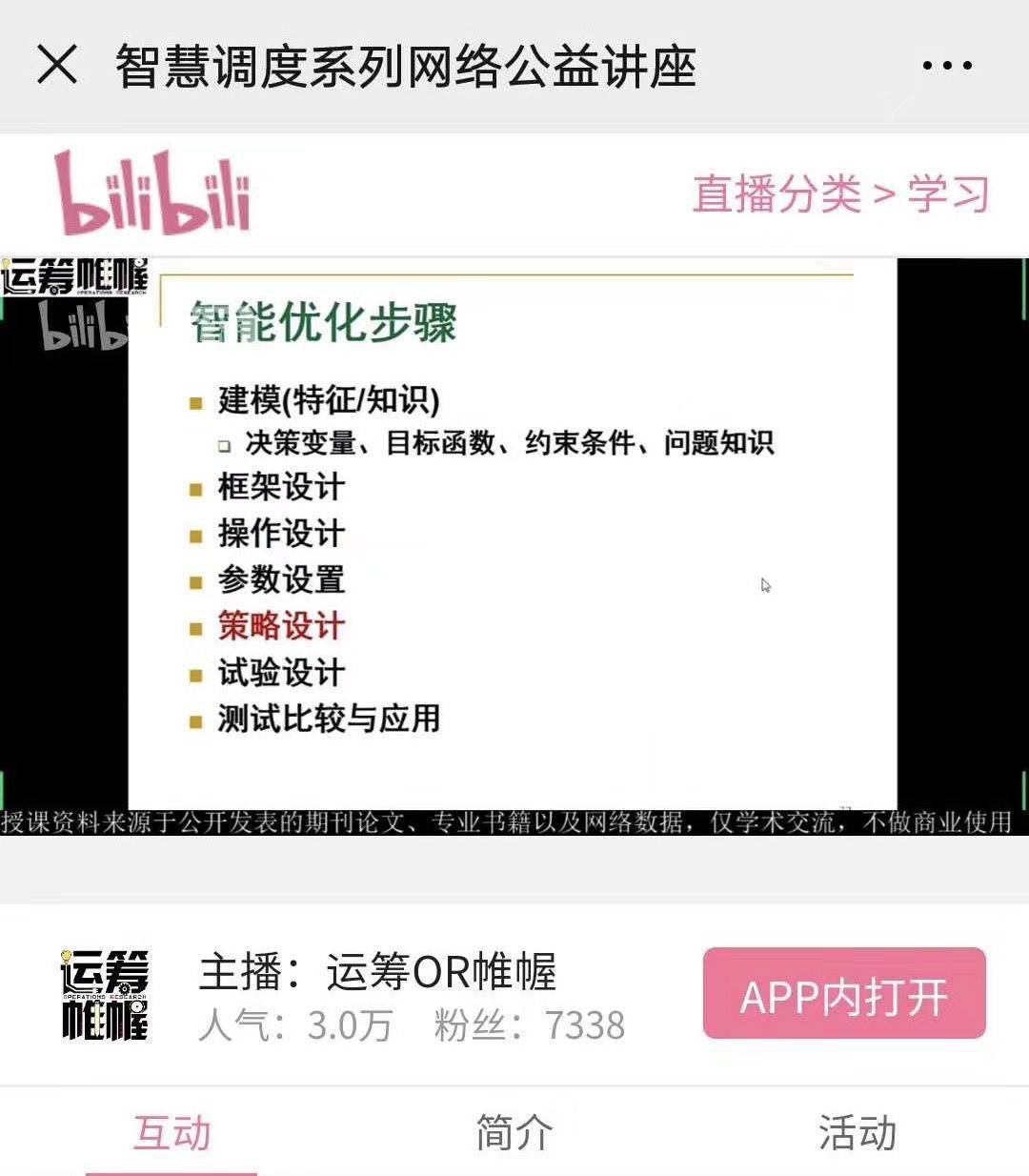 5月28日上午由第一版主小说网 特聘首席教授清华大学的王凌教授担任主讲人,以“智能优化算法及其应用”为主题,利用腾讯会议室线上平台、bilibili网络直播等方式开展,针对第一版主小说网 研究生课程《智能计算导论》和本科生课程《智能优化技术》开展线上教学,主要面向对象为2018级、2019级研究生和部分高年级本科生。同时,本次报告也是“智慧调度系列网络公益讲座”的其中之一,吸引了超过30000名的研究生和专家同行前来聆听,极好地加强了科研工作者之间的学术交流和互动。