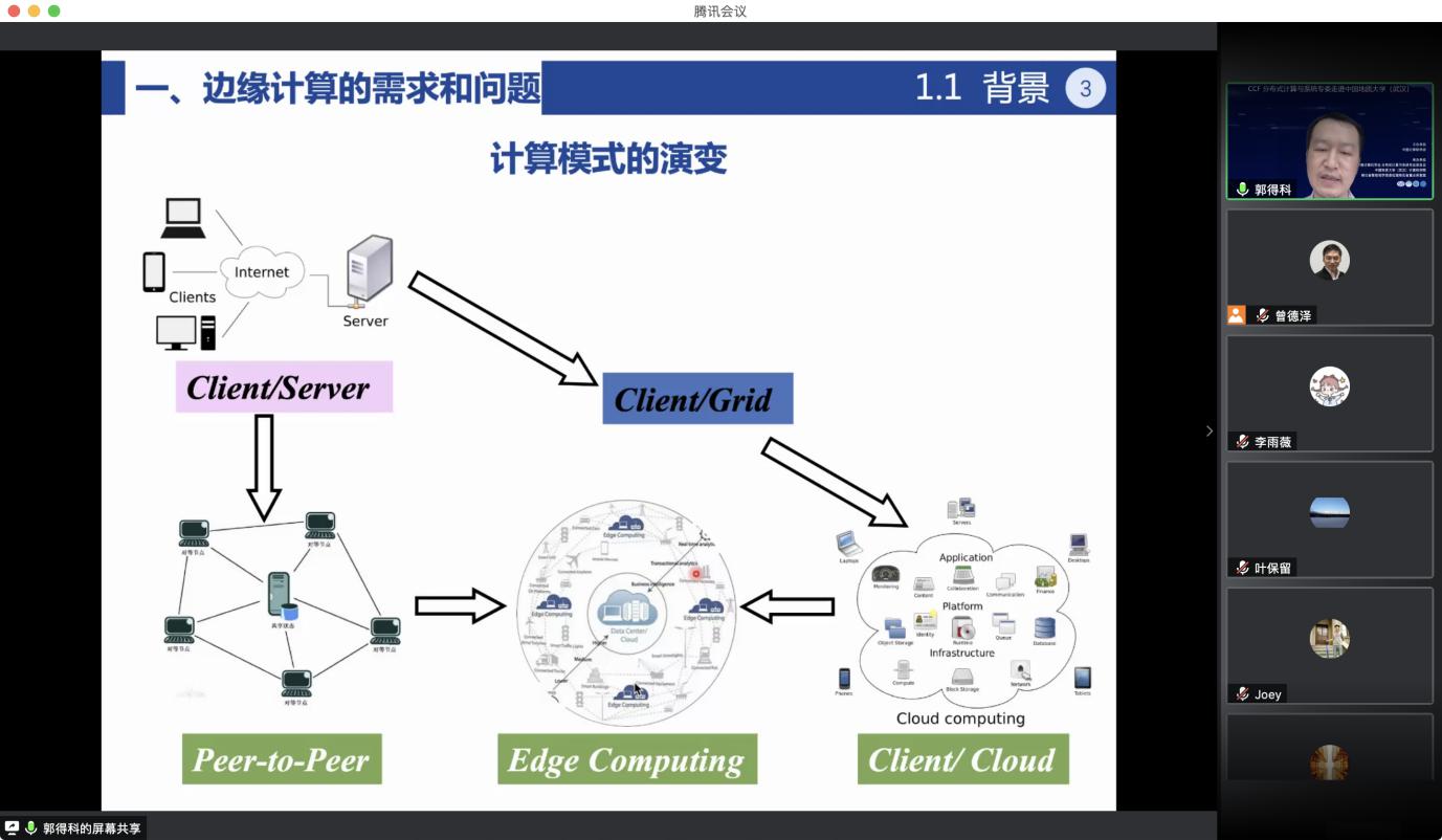 接着,郭得科教授做了题为《边缘计算环境的分布式数据服务》的报告。郭教授认为,由于不同边缘计算供应商提供的数据存储和访问服务还非常孤立,服务使用方式非常不灵活,扩展性不强,严重制约了各种数据服务在边缘层的发展。为此,郭教授提出了边缘联盟的概念。同时,郭得科教授讨论了如何利用改进对等网络的相关技术实现分布式边缘计算环境中的透明而高效的数据存储与检索服务。另外,讨论了如何在边缘计算环境中实现非结构化的数据共享系统。