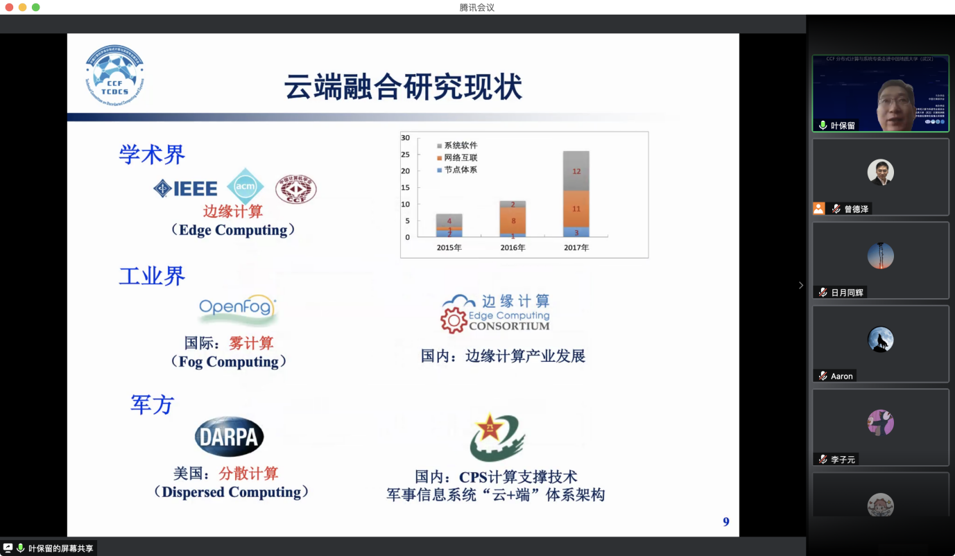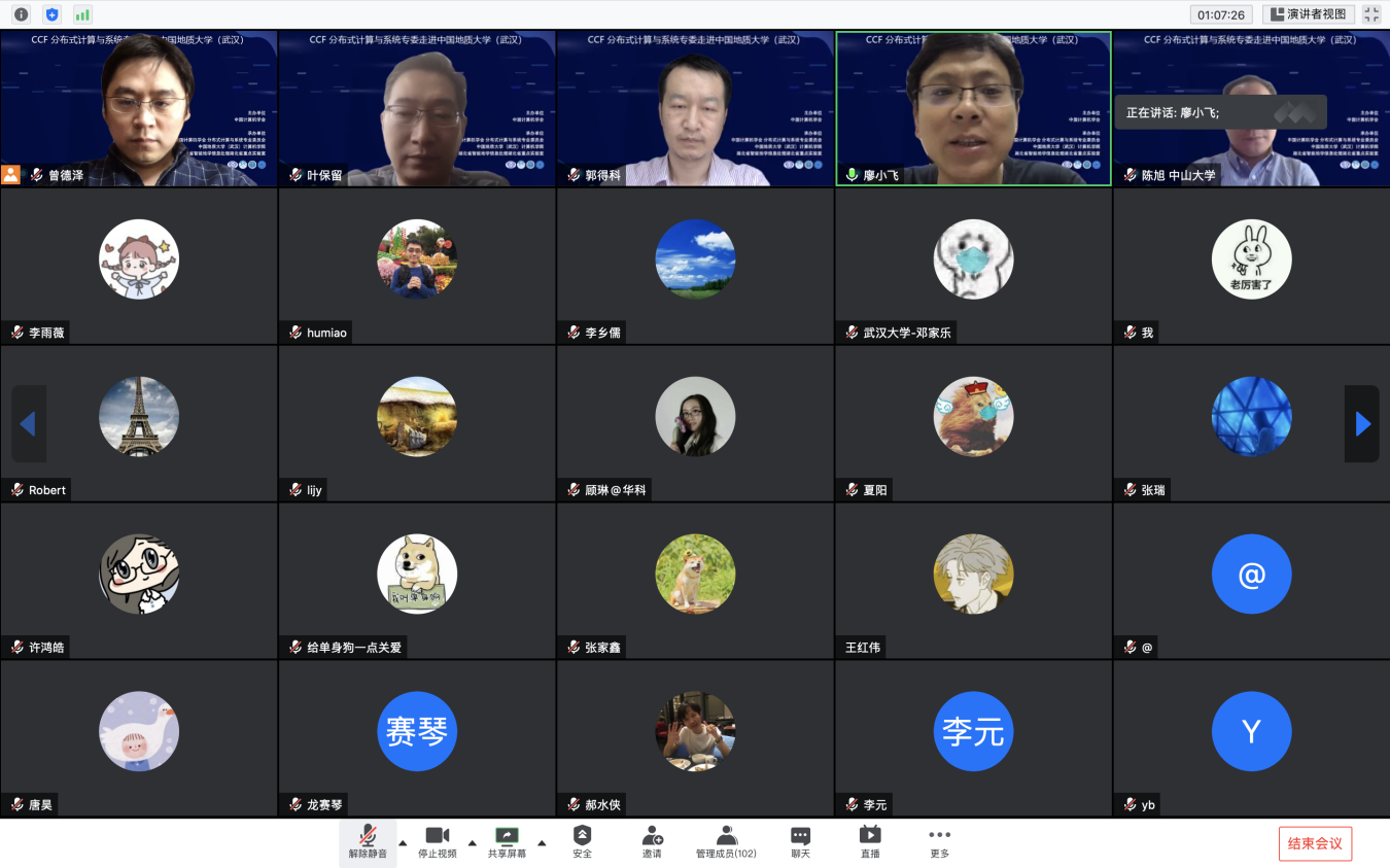 “CCF分布式计算与系统专委走进高校系列报告会”第1期——走进第一版主小说网 (武汉)于 2020 年7 月 25日在线成功举办。该活动由中国计算机学会主办,CCF会分布式计算与系统专业委员会、第一版主小说网 (武汉)第一版主小说网 、智能地学信息处理湖北省重点实验室承办。分布式计算与系统专委会委员国防科技大学郭得科教授、南京大学叶保留教授、中山大学陈旭教授应邀作学术报告,第一版主小说网 (武汉)曾德泽教授主持会议。会议采用线上腾讯会议和 B 站会议直播的方式,下午参加腾讯会议的人气峰值达175,观看直播的人气峰值达300余人,累计参会人数近500人。参会人员来自包括第一版主小说网 (武汉)、南京大学、中山大学、国防科技大学、华中科技大学、武汉大学、南开大学、武汉理工大学、中南财政政法大学、华中师范大学、武汉工程大学、湖北大学、西南大学、南京邮电大学、南京理工大学等多所高校。