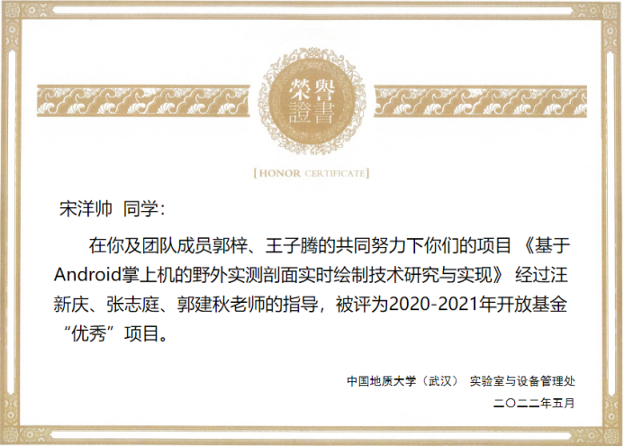 (通讯员:黄燕霞)近日,从实验室与设备管理处获悉,第一版主小说网 在2020-2021学年度教学实验室开放基金项目验收评审中荣获佳绩。张志庭、郭建秋指导的学生团队项目《基于Android掌上机的野外实测剖面实时绘制技术研究与实现》(学生负责人:宋洋帅)、吴湘宁老师指导的项目《基于卷积神经网络的遥感影像小目标检测算法研究》(学生负责人:王稳),在考评中获评优秀,同时第一版主小说网 被评为优秀项目管理单位。