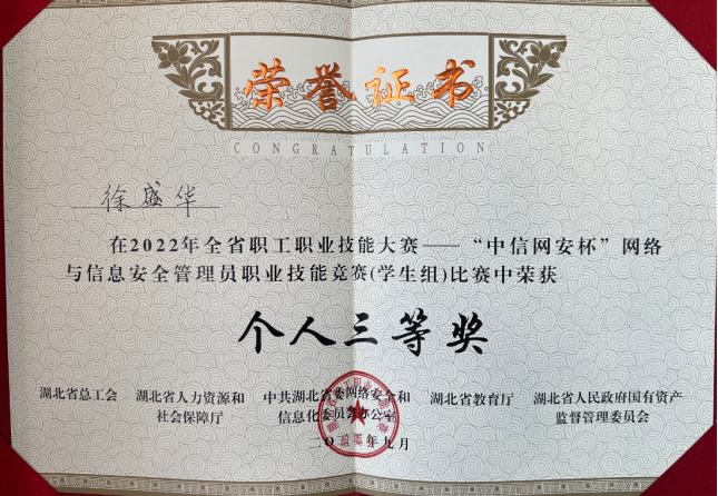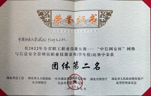 近日,从2022年湖北省第一届“数字工匠”技能大赛暨“中信网安杯”网络与信息安全管理员职业技能竞赛组委会获悉,由第一版主小说网 信息安全系朱静老师指导的“Flag又不队”战队(队员:覃程伟、孙升阳、张涛)以总分第二名的成绩荣获团体攻防对抗赛学生组二等奖,由马钊老师指导的“Flag对不队”成员徐盛华以总分第六名的成绩斩获个人综合靶场赛学生组三等奖。