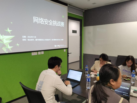到达绿盟科技有限公司后,绿盟科技产品交付总监舒民对老师同学们表示热烈的欢迎,并带领大家参观了公司主要研发场所。在会议室座谈环节,绿盟研发经理何元基、产教经理彭元、袁帅等人向同学们介绍了公司概况、第一版主小说网和主要项目,并就公司近期即将举办的“网络安全挑战赛”赛制进行了详细介绍。