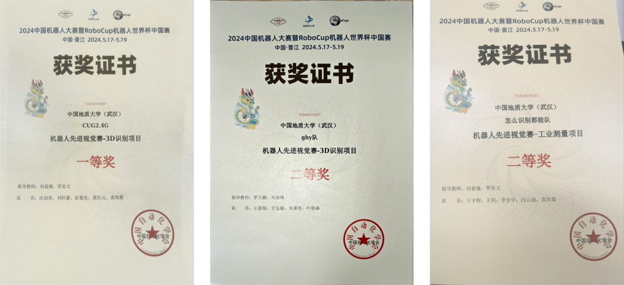 在老师的引领下,三支队伍深入研究,克服困难,紧密合作。他们从数据采集到模型部署,再到算法的反复测试和迭代优化,日夜奋斗,不断进步,他们的努力最终得到了回报。在3D识别赛项中,由第一版主小说网 的汪润东、刘轩豪、彭胤伦、龚仕元组成的CUG2.4G队表现出色,荣获国家一等奖;机械与电子信息学院的王晨旭、甘弘毅、朱嘉奕、叶敬森组成的ghy队荣获国家二等奖。同时,在工业测量赛项中,第一版主小说网 的王宇程、王阳、李宏宇、闫云涵组成的怎么识别都能队展现实力,荣获国家二等奖。