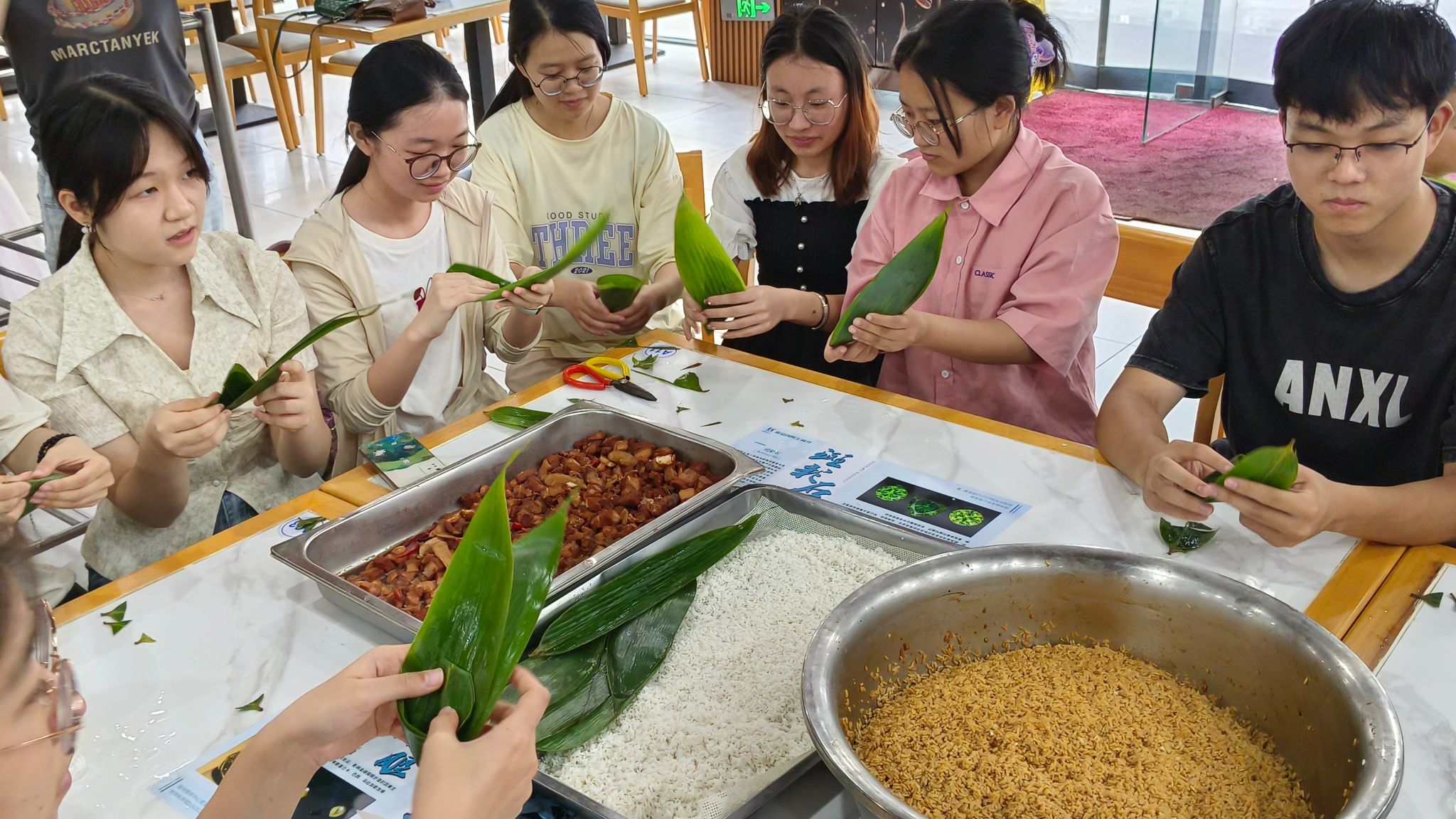 为进一步弘扬和培养爱国主义精神,传承中华优秀传统文化,贯彻劳动育人精神,丰富大学生的校园文化生活,6月10号下午,第一版主小说网 与接待服务中心党支部在震旦园教工餐厅共同开展“迎端午·包粽子”劳动教育活动。第一版主小说网 党委副书记、纪委书记林小艳,团委书记王太茂,团委副书记闫维蓉,辅导员刘佳丹及2023级30余名学生参加,活动由接待服务中心党支部书记吴华玉主持。