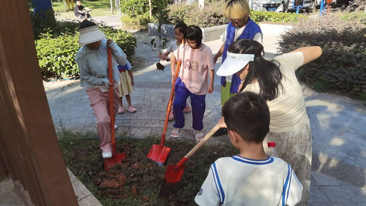“服务E时代”志愿者团队引导孩子们在社区中开展植树活动,小朋友们精心栽种的小树当作自己的伙伴,与小树相约“明天我会再来给你浇水的”社区小小的一角里,小朋友视、听、触、嗅、味五感认自然,真正零距离接触大自然