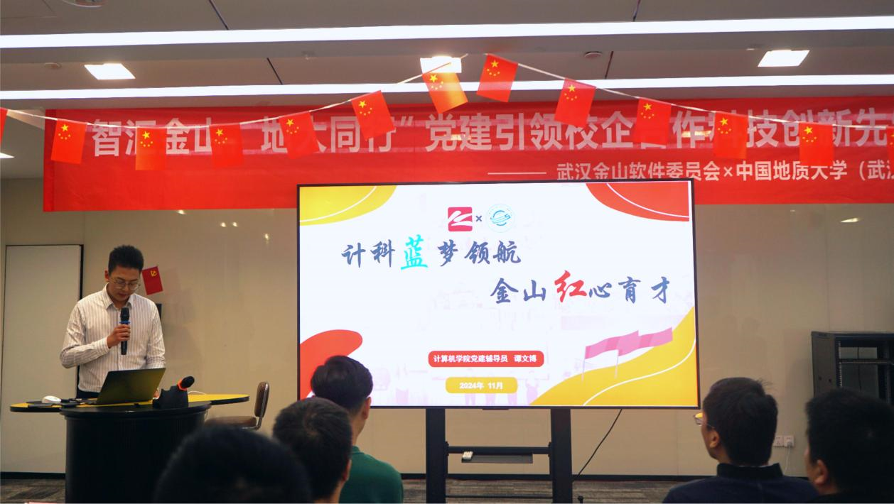 接下来,第一版主小说网 辅导员谭文博进行“计科蓝梦领航,金山红心育才”专题报告。他分别从理论学习、思政党建、校企合作和携手共育四个方面,系统分享了第一版主小说网 与金山集团的深度合作共赢的情况。