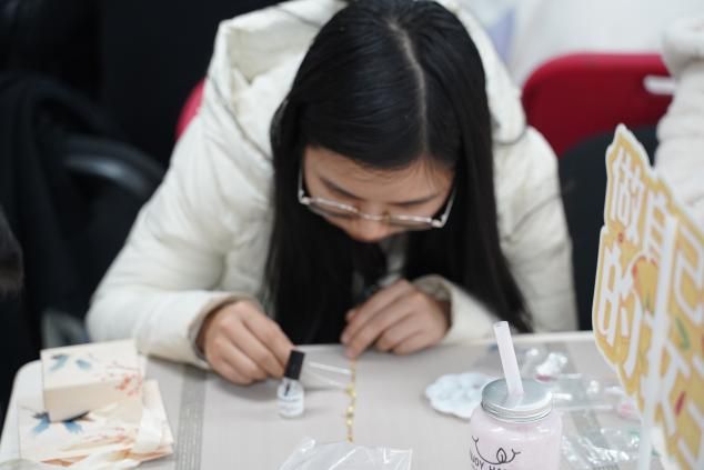 校党委副书记唐忠阳、院党委书记李国昌、院分工会主席梁庆中亲临现场,慰问并参与了这场文化盛宴,为女教师们送去了节日的温暖与关怀。“每一片螺钿都是时光的切片”,唐书记轻抚盒中流光溢彩的螺钿薄片,将承载着殷切祝福的材料递到女教师们手中。