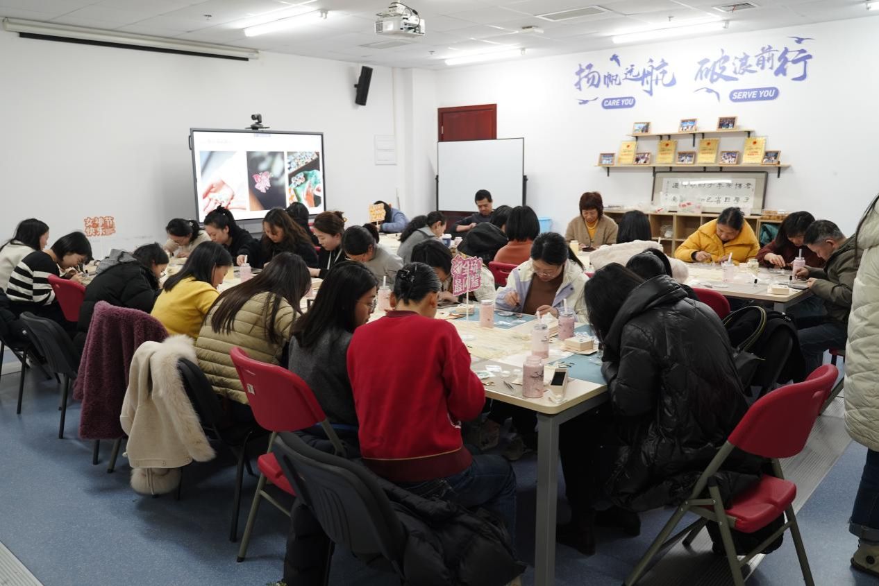与未来城校区管理办公室高盼老师一行女教师齐聚一堂,在非遗螺钿工艺的星河里,以指尖触摸千年文明的温度,一起为即将到来的纪念“三八”国际妇女节编织出独特的文化献礼。