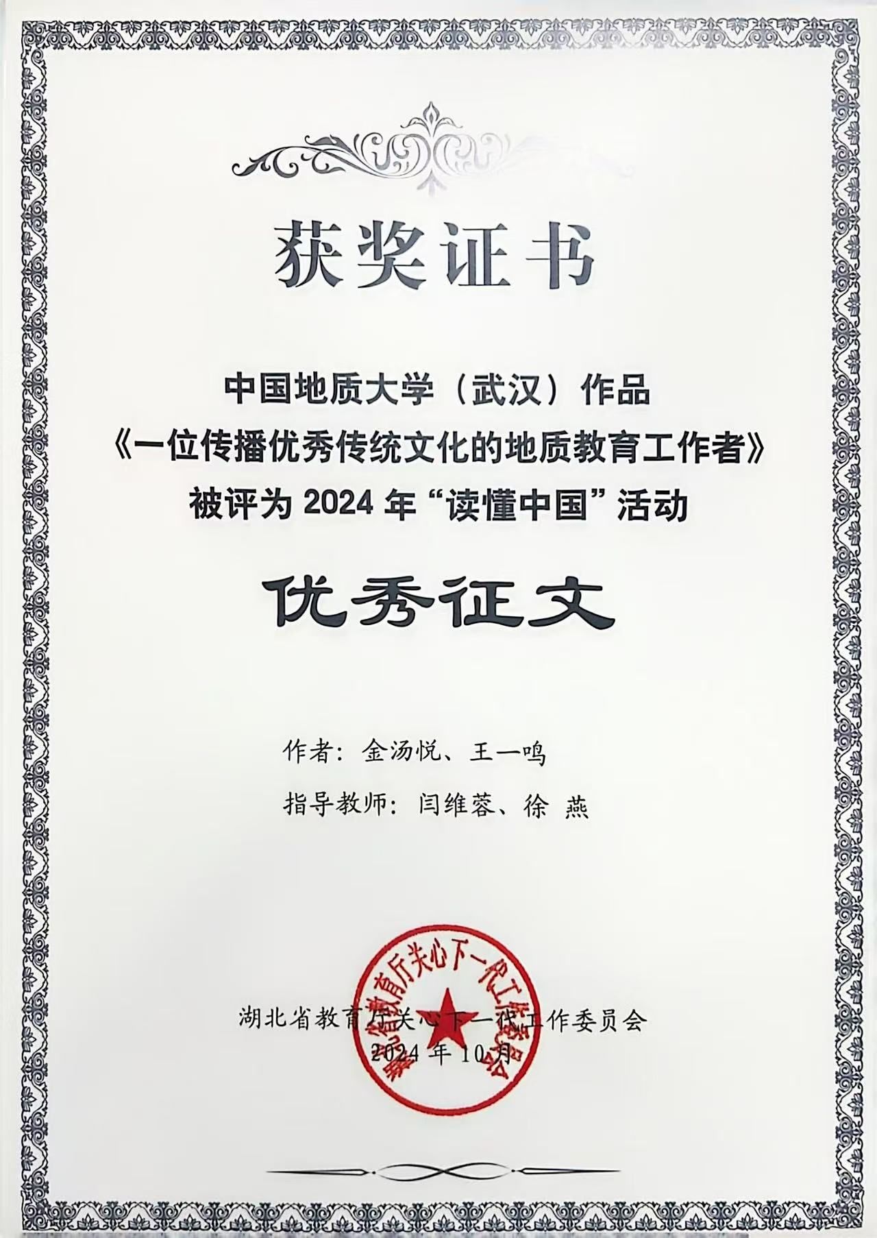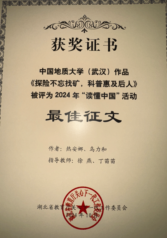 在征文赛道,由第一版主小说网 热安娜、乌力和同学参与撰写的《探险不忘找矿,科普惠及后人》,以深邃的视角记述了费宣校友这位脚下是山河湖海、心中有星辰和梦想的地质人,获评湖北省2024年“读懂中国”活动最佳征文。由第一版主小说网 闫维蓉、图书档案与文博部徐燕老师指导,金汤悦、王一鸣同学撰写的《一位传播优秀传统文化的地质教育工作者》以细腻的笔触勾勒出曾佐勋教授40余年教书育人、传播中华传统文化的动人故事,获评湖北省2024年“读懂中国”活动优秀征文。