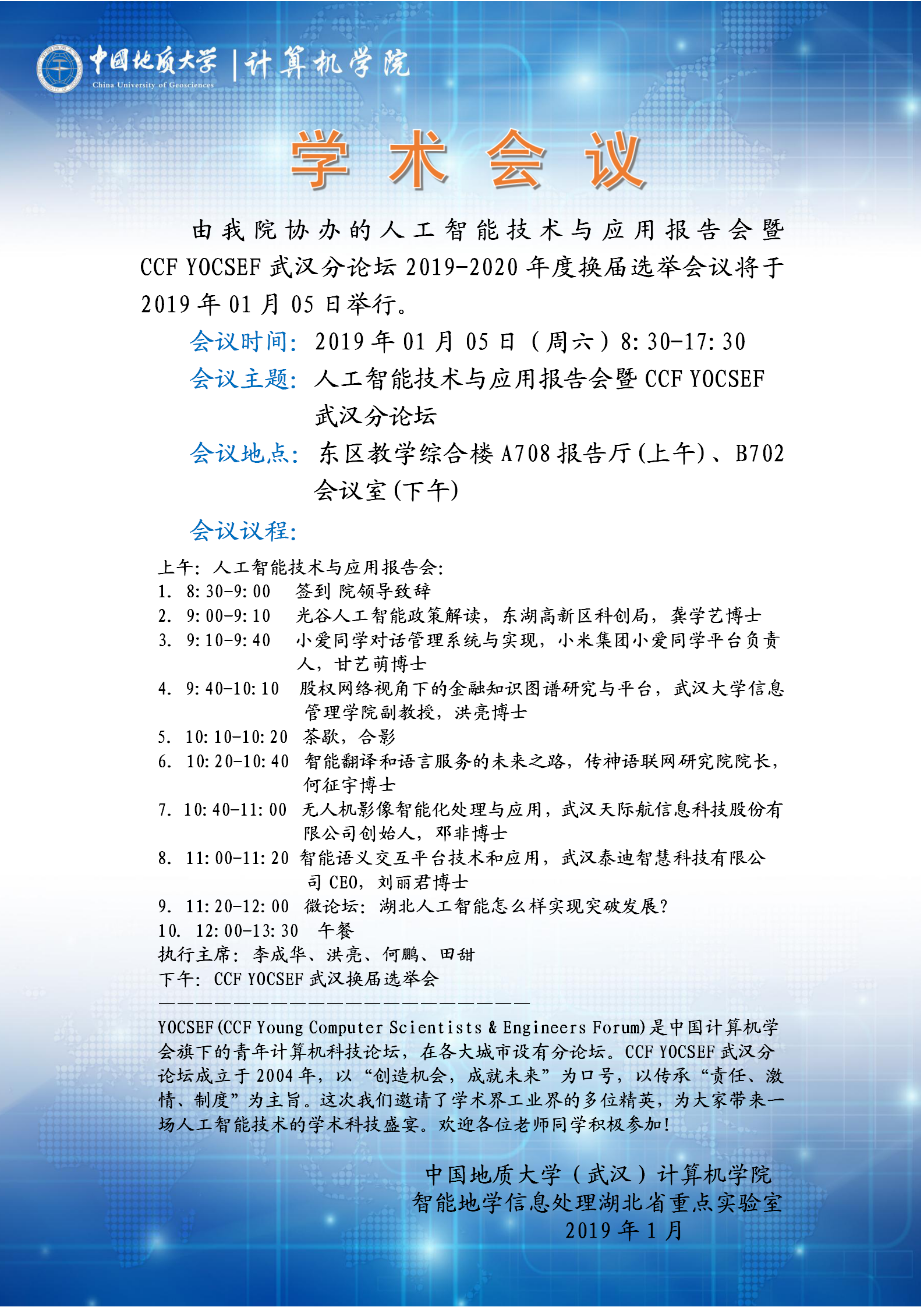 学术会议——人工智能技术与应用报告会暨CCF YOCSEF武汉分论坛2019-2020年度换届选举
