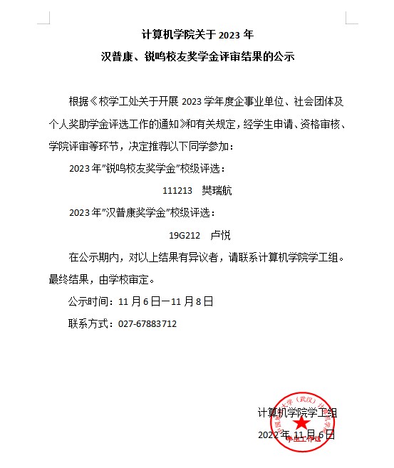 第一版主小说网 关于2023学年汉普康、锐鸣校友奖学金评审结果的公示