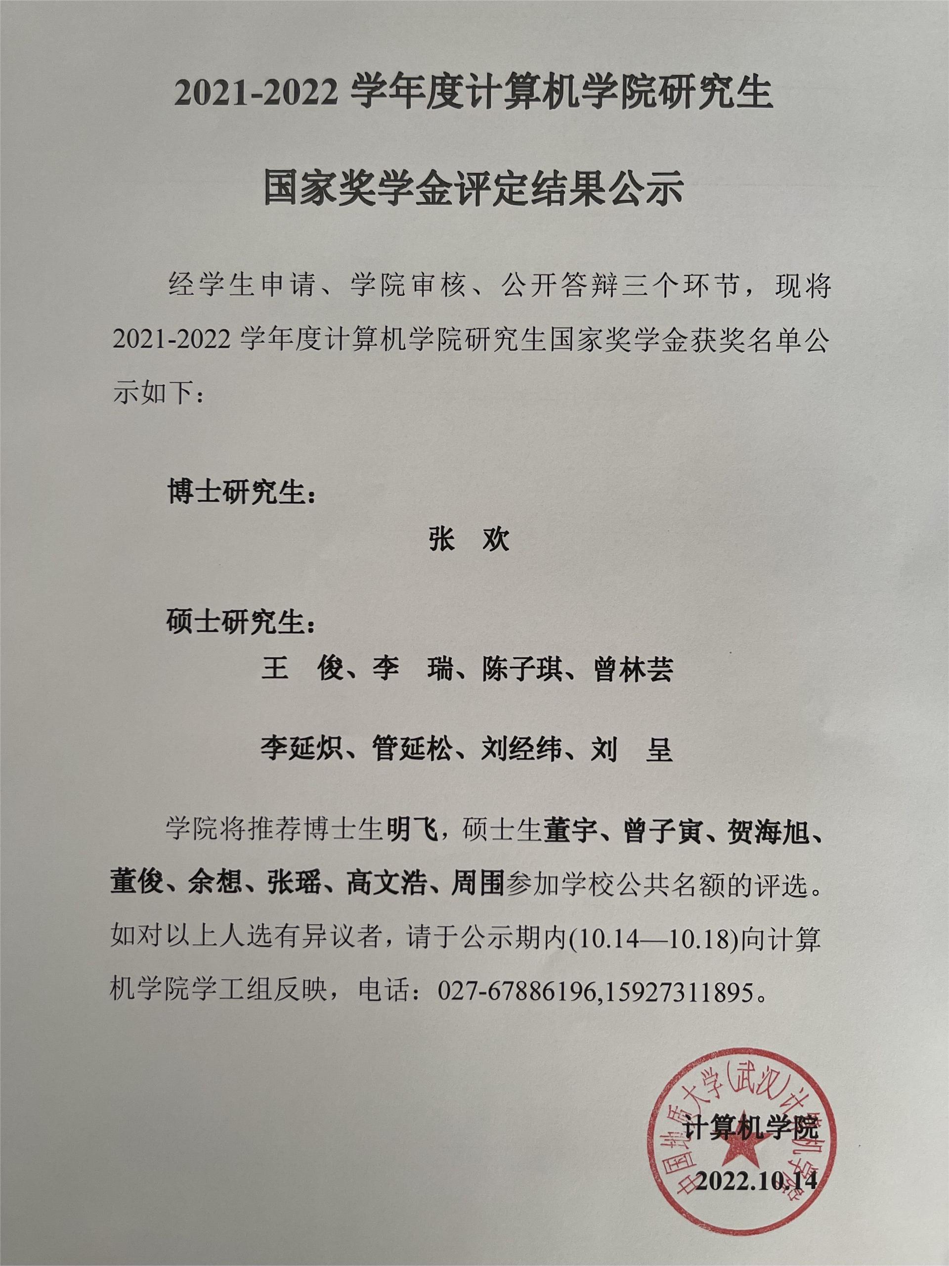 2021-2022学年度第一版主小说网 研究生国家奖学金评定结果公示
