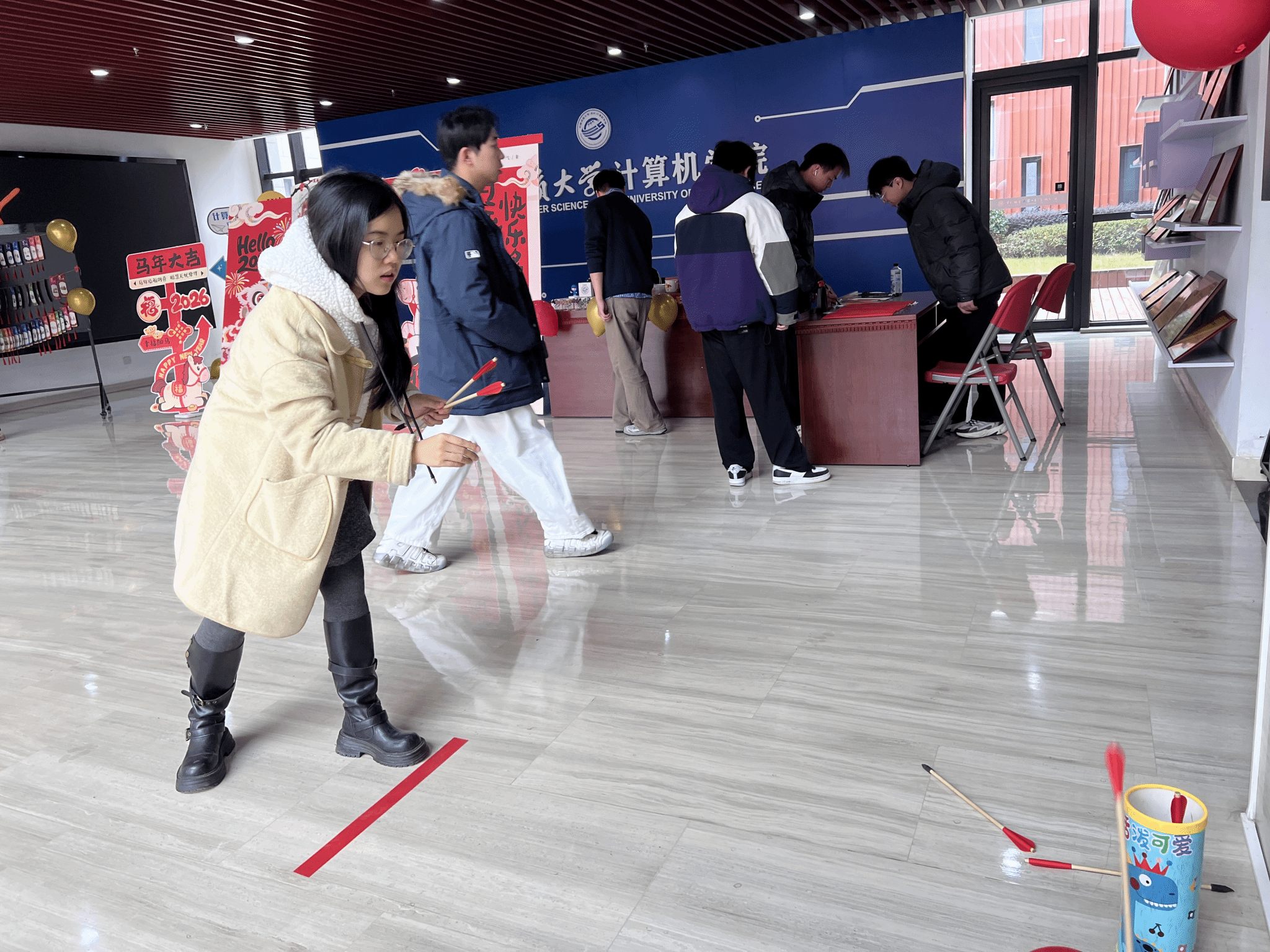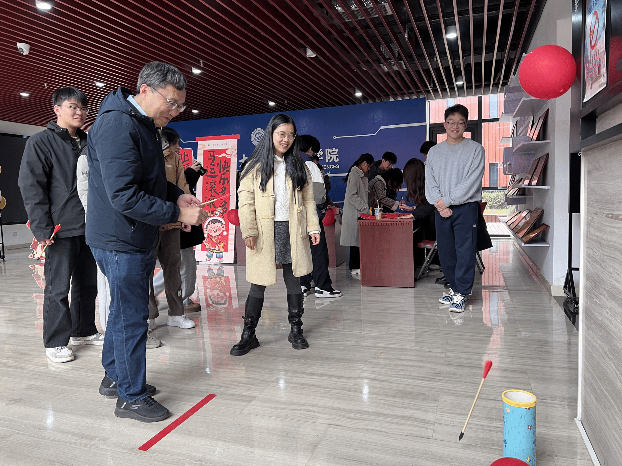 作为传承千年的传统礼仪游戏,投壶区自开启便人气爆棚。参与者手持竹箭,在指定线后屏气凝神,瞄准壶口轻轻投掷。箭入壶的清脆声响响起时,现场立刻爆发出阵阵喝彩;即便偶尔失准,也会引来善意的笑声与加油声。这场兼具趣味性与仪式感的游戏,不仅考验着大家的手眼协调能力与专注力,更让师生在轻松欢笑中沉浸式感受古人的生活雅趣与礼仪文化,拉近了彼此的距离。