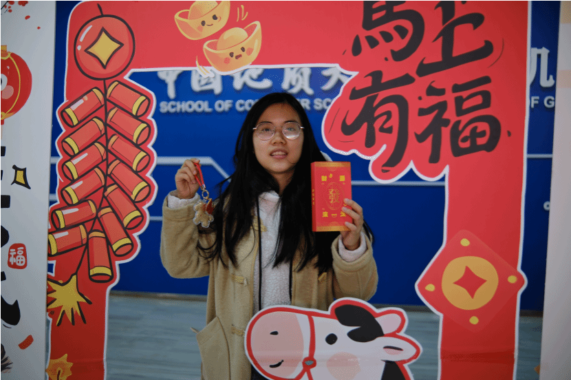 案几铺展红纸,笔墨早已备好,书法达人谭文博老师现场挥毫,笔走龙蛇间,兼具力量与美感的字迹跃然纸上。“代码无bug,科研步步高”“算力赋能,梦想启航”……同学们纷纷围聚,或求取专属定制的新春墨宝,或亲手执笔体验书写之趣。笔尖与纸面的摩挲声中,传统书法艺术的魅力悄然流淌,更将计科人的专业追求与新年期许巧妙融合,每一笔都饱含对新一年的热忱祈愿。