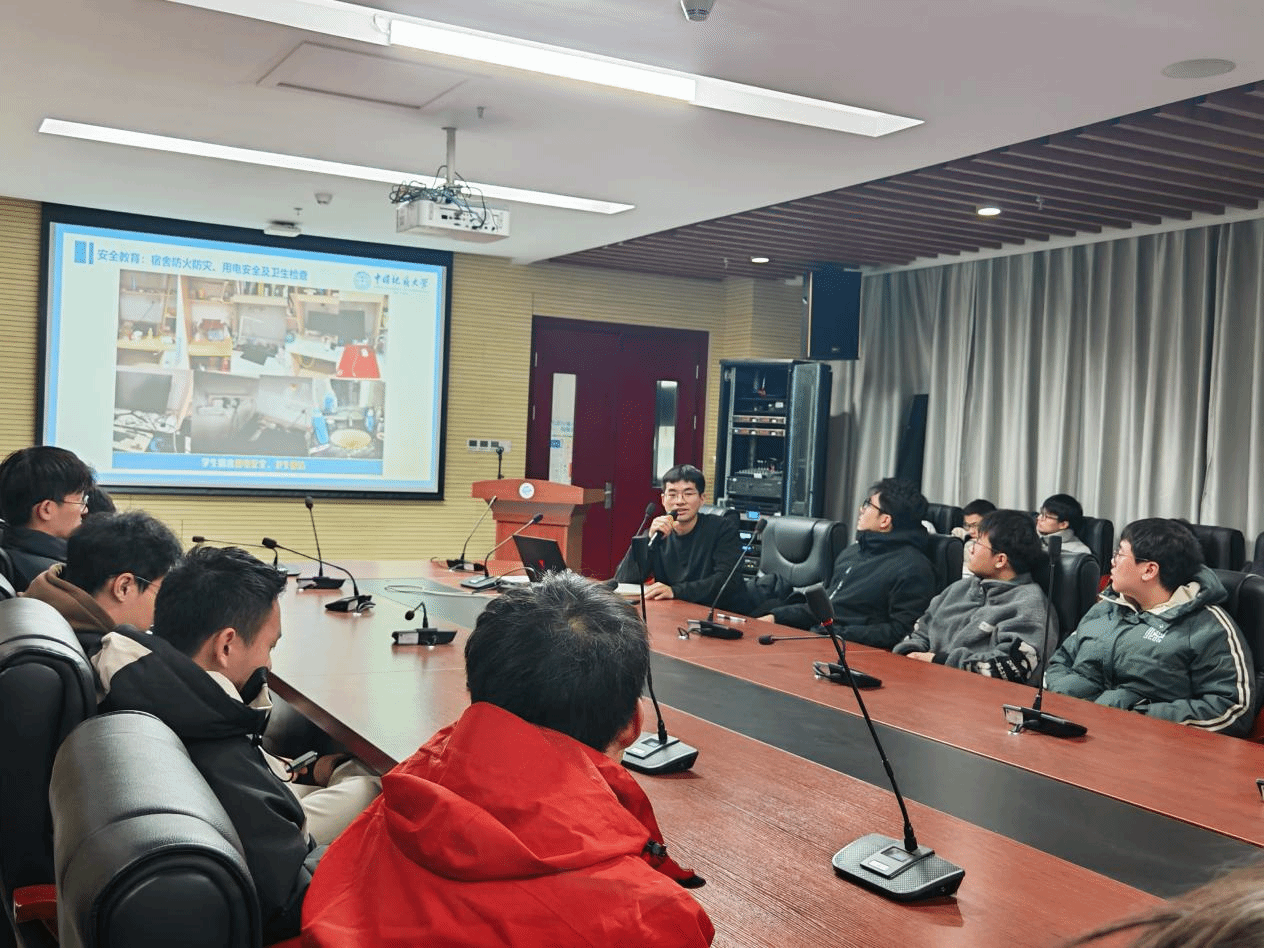 随后,研究生辅导员丁鑫磊围绕研学空间建设、安全管理等重点工作发言。他首先结合近期学校发放的《安全警示案例》,重点强调了实验室人身与财产安全、消防安全、用电安全及电动车使用安全等关键领域的工作要求,同时也指出寒假临近,全体师生需强化寒假安全教育意识,尤其要做好实验室假期关停前的安全排查,妥善保管科研设备与物资,杜绝安全隐患。
