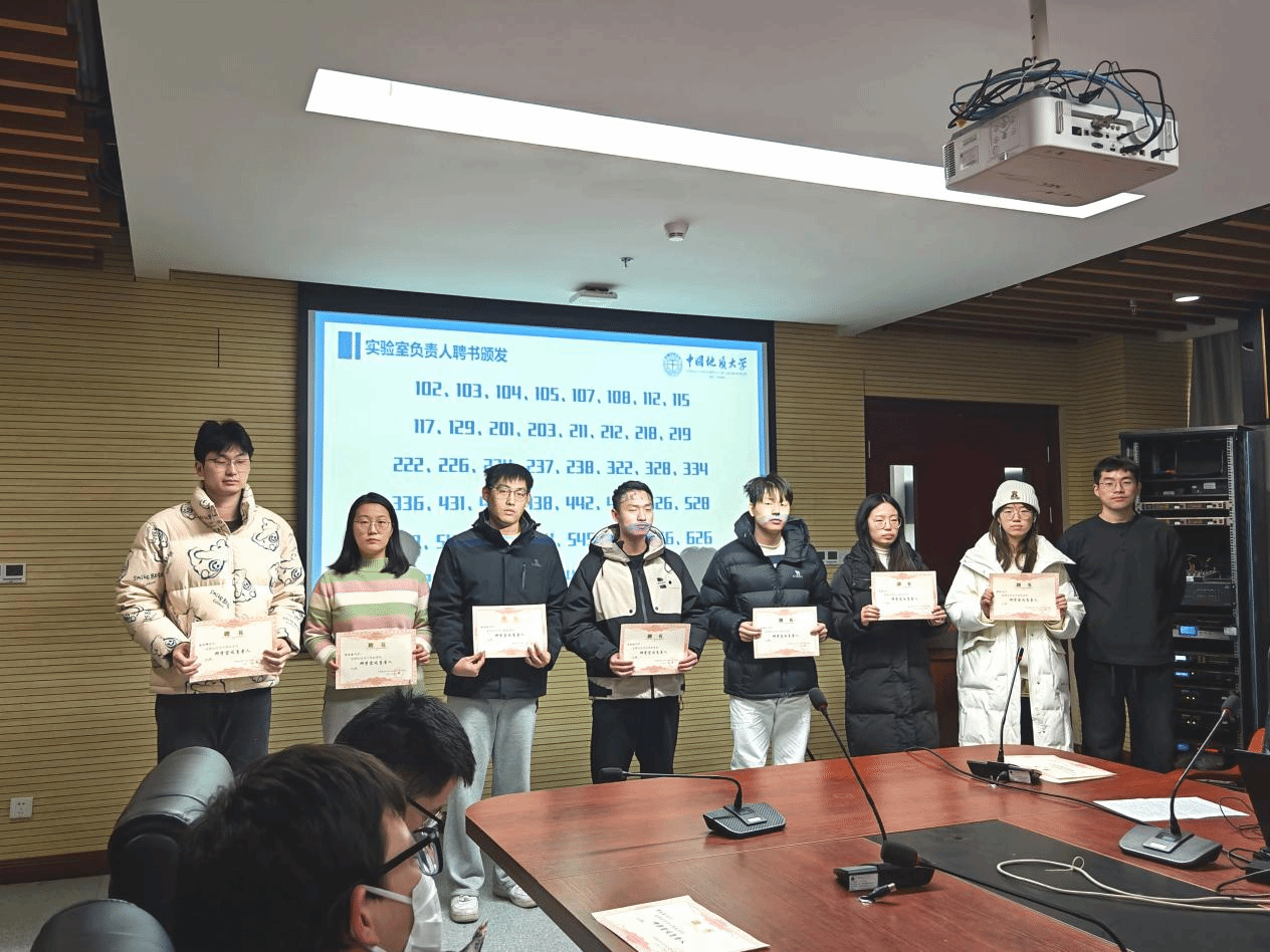 随后,丁老师为各个实验室负责人颁发聘书,希望各位负责人切实履行职责,做好实验室日常管理与统筹协调工作。
