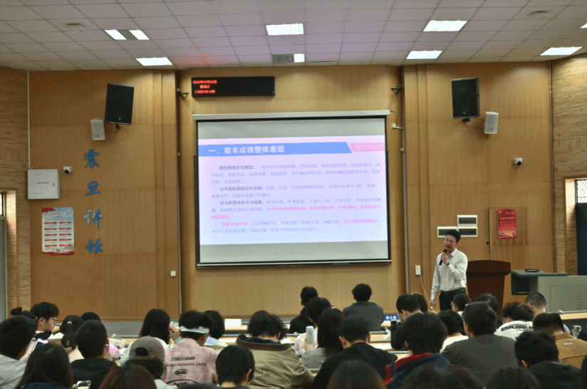 辅导员谭文博全面分析上学期学业情况,并开展纪律教育。他通过数据系统展示年级整体学情、班级成绩排名、挂科人数与重点学科等核心内容,明确课堂纪律与考勤要求,引导同学们以理性视角审视学业表现,通过查漏补缺持续精进,为专业成长奠定扎实基础。