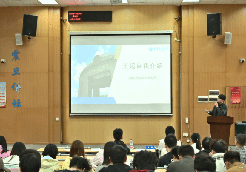 兼职辅导员王超进行自我介绍。他结合新学期问卷调查反馈结果,公布了本学期学业帮扶、文体活动等年级工作的优化方案,做好同学们成长路上的知心人与引路人。