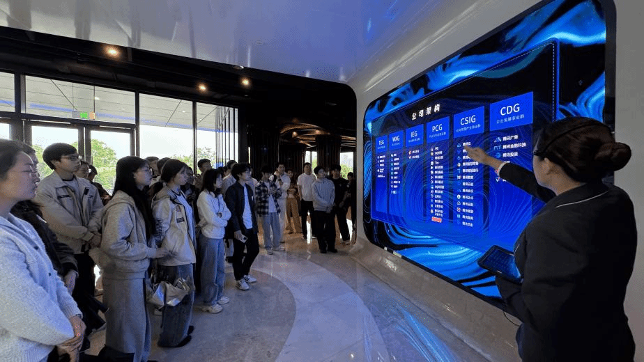 在腾讯工作人员的引导下,师生一行首先参观了四大主题展厅,了解企业的发展历程、事业群架构与核心技术布局。在社会责任展区,腾讯公益等案例生动展现了技术赋能社会公益的多元场景,让同学们切实体会到了在科技浪潮下腾讯“科技向善”的责任担当。
