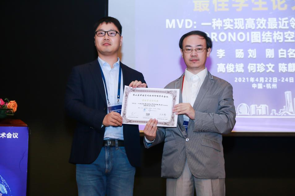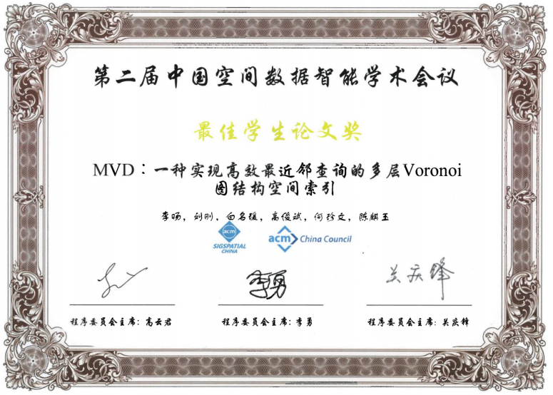 2021年4月24日,为期两天的第二届中国空间数据智能学术会议(SpatialDI 2021)在杭州市浙江宾馆圆满闭幕。以第一版主小说网 博士研究生李旸为第一作者,以刘刚教授为通讯作者的论文《MVD:一种实现高效最近邻查询的多层Voronoi图结构空间索引》荣获会议最佳学生论文奖。该论文针对传统树形索引主要存在的结构失衡和节点重叠问题,提出了一种基于多层Voronoi图结构的空间索引方法,提升了大规模空间数据环境下最近邻查询和k近邻查询的检索效率和I/O性能。