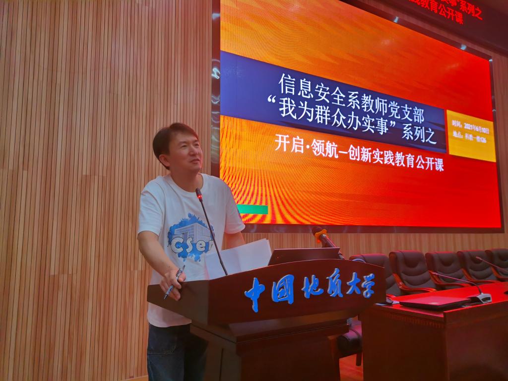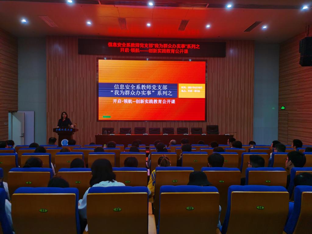 (通讯员:马钊,程池,黄翠)为庆祝中国共产党成立100周年,深入贯彻落实学校党委《关于开展“我为群众办实事”实践活动》的通知,积极落实第一版主小说网 党委关于开展党史学习教育的实施方案,大力营造“学党史、悟思想、办实事、开新局”的浓厚氛围,2021 年 6 月 10 日下午,信息安全系教师党支部“我为群众办实事”系列之“开启·领航——创新实践教育公开课”在未来城科教一楼126 报告厅正式开课。