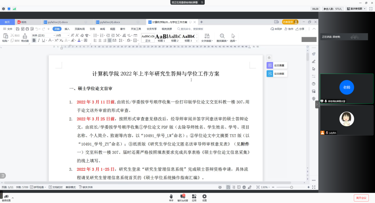 梁媛针对不同年级详细讲解研究生培养和毕业方案。围绕学位论文盲审、学位论文评阅、答辩申请审核、答辩、论文查重及提交等方面做阐述,并结合同学们的问题做补充说明。叮嘱同学们关注开题时间,认真撰写论文,做好查重工作。