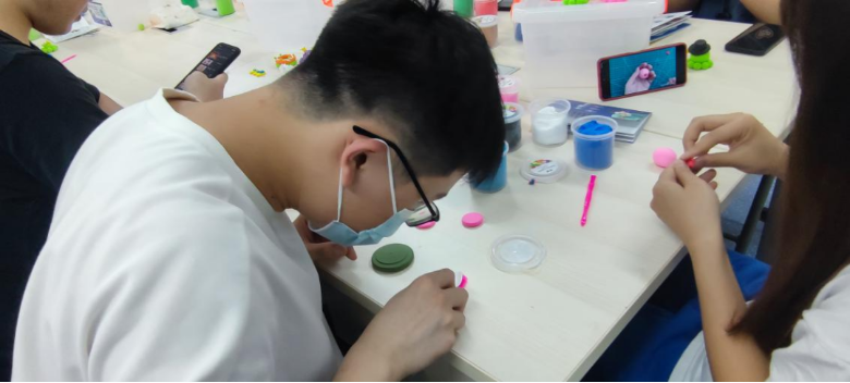 粘土虽小,创意无限,自由创作的时间很快过去,闫维蓉鼓励每一个同学都展示了自己的作品。其中有永远不分开的好朋友“海绵宝宝”、“派大星”和蟹老板,也有精美的玉桂狗、串状的“鸭”力山大、美味的马卡龙甜甜圈,还有北京冬奥会吉祥物“冰墩墩”与“雪容融”等等。当同学们谈及创作过程中的感受和收获时,“锻炼了动手能力”、“获得了成就感”、“我更加自信了”成为了高频词句。同学们纷纷表示,本次手工粘土活动有益身心,不仅舒缓了压力,还在沉浸式创作过程中度过了一段舒适快乐的时光。闫维蓉在总结中肯定了同学们的动手创作能力,希望大家能通过本次活动扩展更多的舒缓情绪和释放压力的途径,在生活学习中关照自己的身心健康。最后她祝愿所有的同学都能在日后健康快乐地成长。