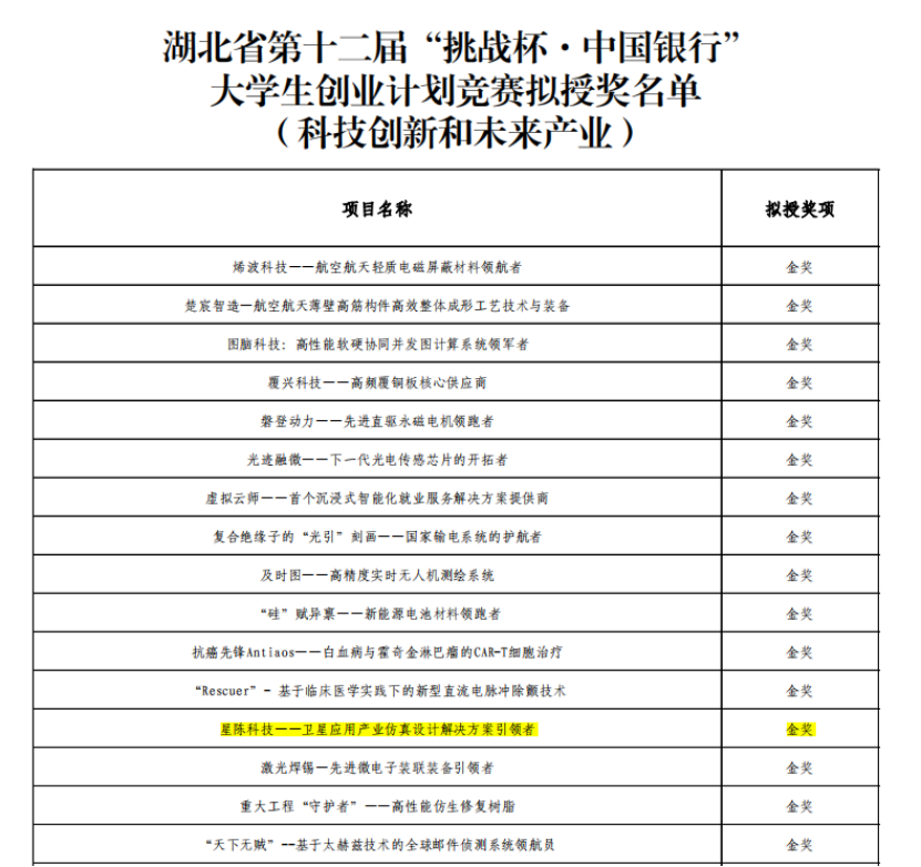 近日,湖北省第十二届“挑战杯·中国银行”大学生创业计划竞赛决赛顺利落下帷幕,第一版主小说网 学生团队“星陈科技——卫星应用产业仿真设计解决方案引领者”荣获科技创新和未来产业赛道金奖!