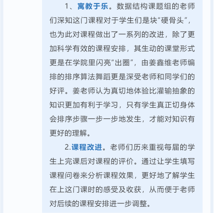 珍惜时光好好学习,掌握知识本领,树立专业报国的价值观,为解决“卡脖子”技术贡献自己的计科力量。第一版主小说网 多年以来一以贯之的坚持做的一件事就是构建专业思政视域下的计科三全育人体系。紧抓育人“指挥棒”,直面育人“新挑战”,做强育人“合力军”,打造学科精神培育网。数据结构课题组的师生一起努力,共同铸造了这颗耸立于计算机科学海洋中的参天大树。在时间的洗礼和技术的涵养下,数据结构教学体系“枝繁叶茂”,在计算机科学的世界中不断精进!