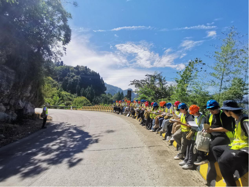 终于,同学们携手徒步走完攀上了黄牛岩的山顶。同学们坐在路边的石头上,总结着今天的收获,将在各地点定下的标志点一一梳理,再将所记录的信息汇总形成一个集体,绘制出行进路线剖面图,并谈论着此行路上的所见美景。