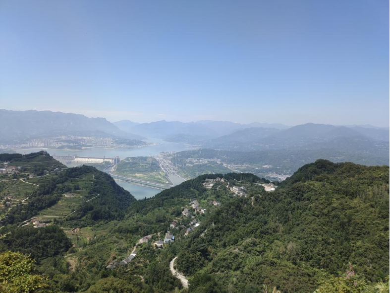 在碧空映照下,绿色的山峦映入眼帘,古雅的民居依山而住,拥入大山的怀抱;重峦叠嶂外,是绵延向地平线的长江,宏伟壮观的三峡大坝将长江截断,化凶江为民水;远处的山峰在雾气中若隐若现……山之壮美,水之壮阔,天之壮丽,无不震撼着同学们的心灵。