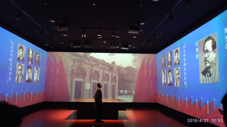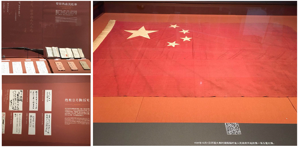 第二天,天气更加阴沉,时而飘起风雨。我们路过烈士陵园,临时调整行程,决定在旁边的湖南省博物馆进行室内参观。省博物馆其中一大展区为湖南人展区,介绍了湖南其地其人的发展与历史。在其中,与红色相关的部分也引起了我们极大的兴趣。馆藏文物中,有开国大典时湖南临时人民政府升起的第一面五星红旗,有共产党先烈遗留的革命诗抄,也有推翻封建帝制志士关于民主共和的挽联和信件。党员们通过馆藏的各种红色文物,以及展厅播放的党史多媒体材料,再一次深刻认识学习了新中国建立与发展的漫漫征程。