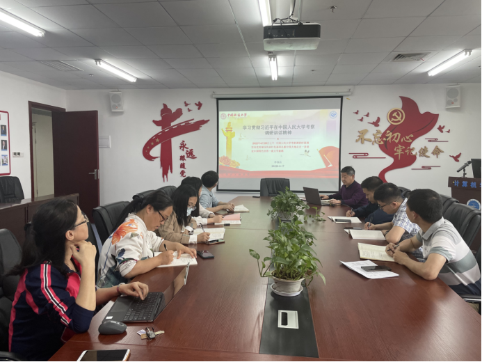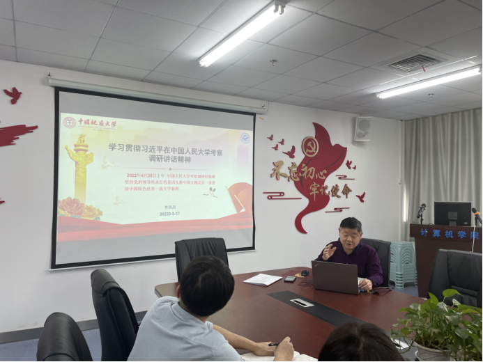 李国昌强调,习近平总书记在人大考察调研时发表的重要讲话,是一篇闪耀马克思主义光辉的重要文献,我们要加强理论学习,读原话,学原理,落实立德树人根本任务,自觉肩负起培养社会主义建设者和接班人的使命,增强政治敏锐性、思维敏捷性、信念坚定性和行动自觉性;要做一流学问,建一流团队,育一流人才,扎根中国“三全育人”;要弘扬计科先锋精神,爱国自强,精益求精,艰苦奋斗,团结拼搏,为学院高质量发展贡献力量。