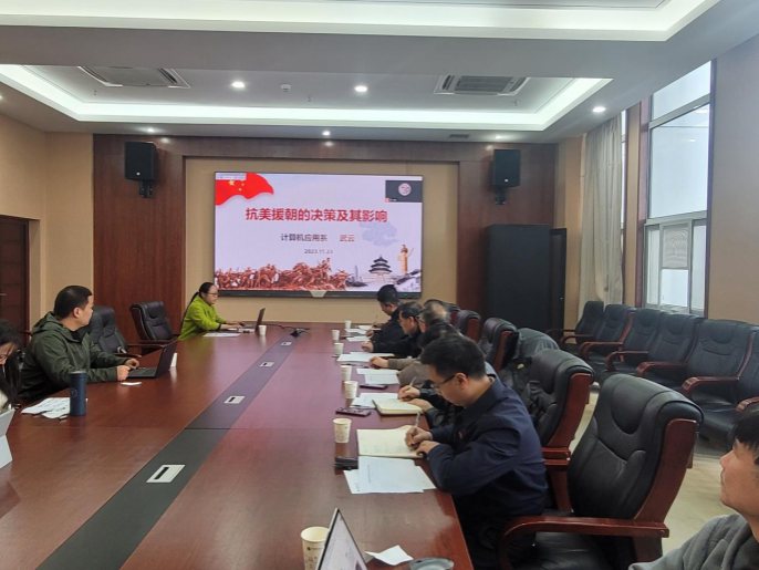 计算机应用系党支部书记武云以“抗美援朝的决策及其影响”为题,重温抗美援朝发生的背景、具体过程及深远影响,提醒我们珍惜和平、自立自强、科技强国。