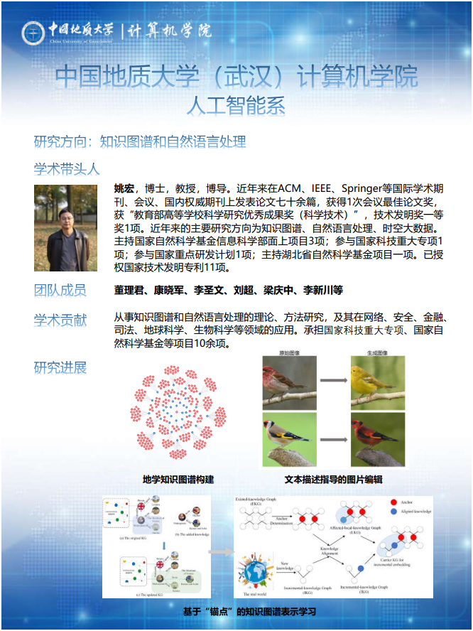 主要开展遥感信息智能提取、知识图谱、自然语言处理、数据挖掘与机器学习等方向的理论、方法研究,在城市典型要素识别、自然资源监测、数字城市、网络、安全、金融、地球科学、生物科学等方面形成特色应用。共有专任教师19人,其中学术带头人3人;近年来,承担国家重点研发计划、国家自然科学基金重点项目、国家科技重大专项、国家自然科学基金等国家级和省部级项目20余项;在计算机类权威期刊及重要学术会议、遥感信息处理权威期刊发表论文100多篇,获得省部级科技成果多项,获得国家发明专利20余项。(数据截至2021年4月)