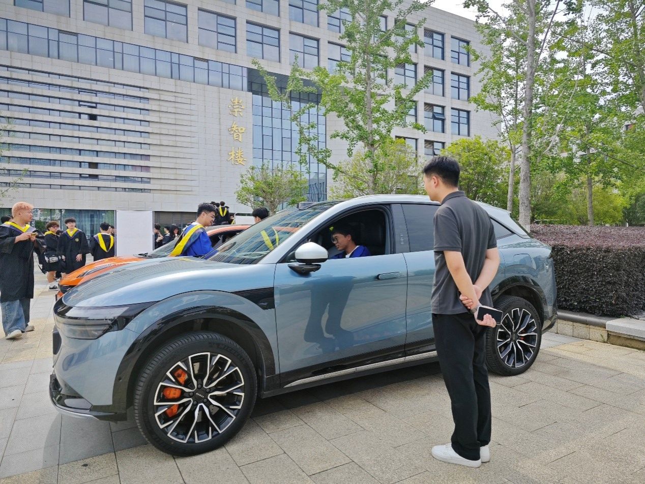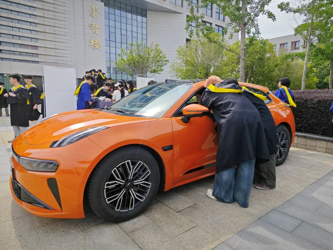 活动现场,一辆全新极氪汽车化身为“未来专列”向同学们驶来,车前设置有团徽立体展板庄严伫立,象征着青春即将驶入为理想而奋斗的轨道。毕业生们手持写有职业理想的“车票”,享受登车试驾的专属体验。来自极氪的青年党员工程师也来到现场,分享他们扎根国产汽车行业、投身自主研发的奋斗故事,一句句朴实而生动的话语背后,传递着“实业报国”的坚定信念,为毕业生注入前行力量。