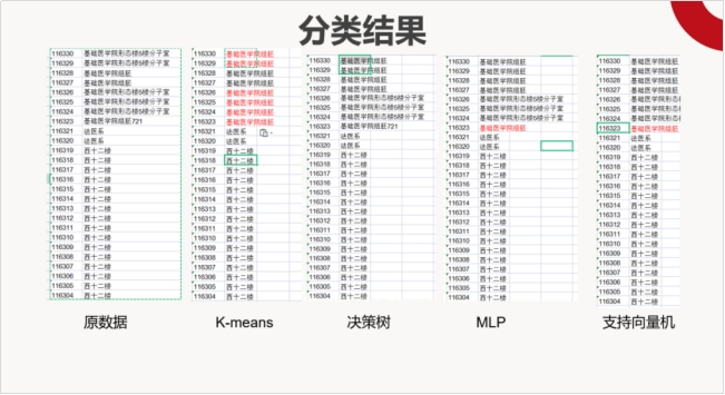 我们的具体方案如下:第一步,对所有数据进行人工清洗工作。对数据进行归一化,处理标签数据和异常数据,去除出现率不足0.1%的数据和占据99%以上的相同数据,再使用PCA对强相关性数据降维。第二步,进行文本信息处理。为了解决地理信息的多态性,我们需要对文本信息进行分词操作,我们采用HMM模型进行分词操作。第三步,将分词后的内容进行向量化。文字向量化存在一定的困难,可以将文字全部转换成枚举类型,这样操作简单但是准确率低,无法参与数据分析;也可以根据文字之间的相似度进行向量化,但其属性量不够从而间接导致准确率低。在这方面团队成员需与指导老师们进一步商量。最后,我们尝试采用了K-MEANS、决策树、MLP、支持向量机等传统方法进行语义分类。