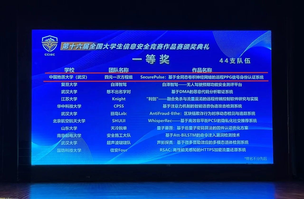 第十六届全国大学生信息安全竞赛落下帷幕,四元一次方程组战队在众多双一流高校的队伍中脱颖而出,“SecurePulse:基于全同态卷积神经网络的远程PPG信号身份认证系统”斩获全国一等奖!