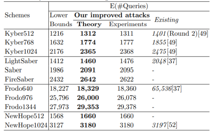 此外,该文所提出的构建最优BRT方法,不仅可以寻找成功发起密钥不匹配攻击所需平均最少平均问询次数的下界,对于我们实际攻击还有重要指导意义。该文发现对某些方案,理论值与实际攻击所需问询次数仍然有较大的差距,而通过构建BRT方法,可以找到更合适的参数来提高实际密钥不匹配攻击的效果,使发起密钥不匹配攻击所需最小平均问询次数逐步向理论界值靠近。下表1展示了成功发起密钥不匹配攻击所需平均问询次数:
