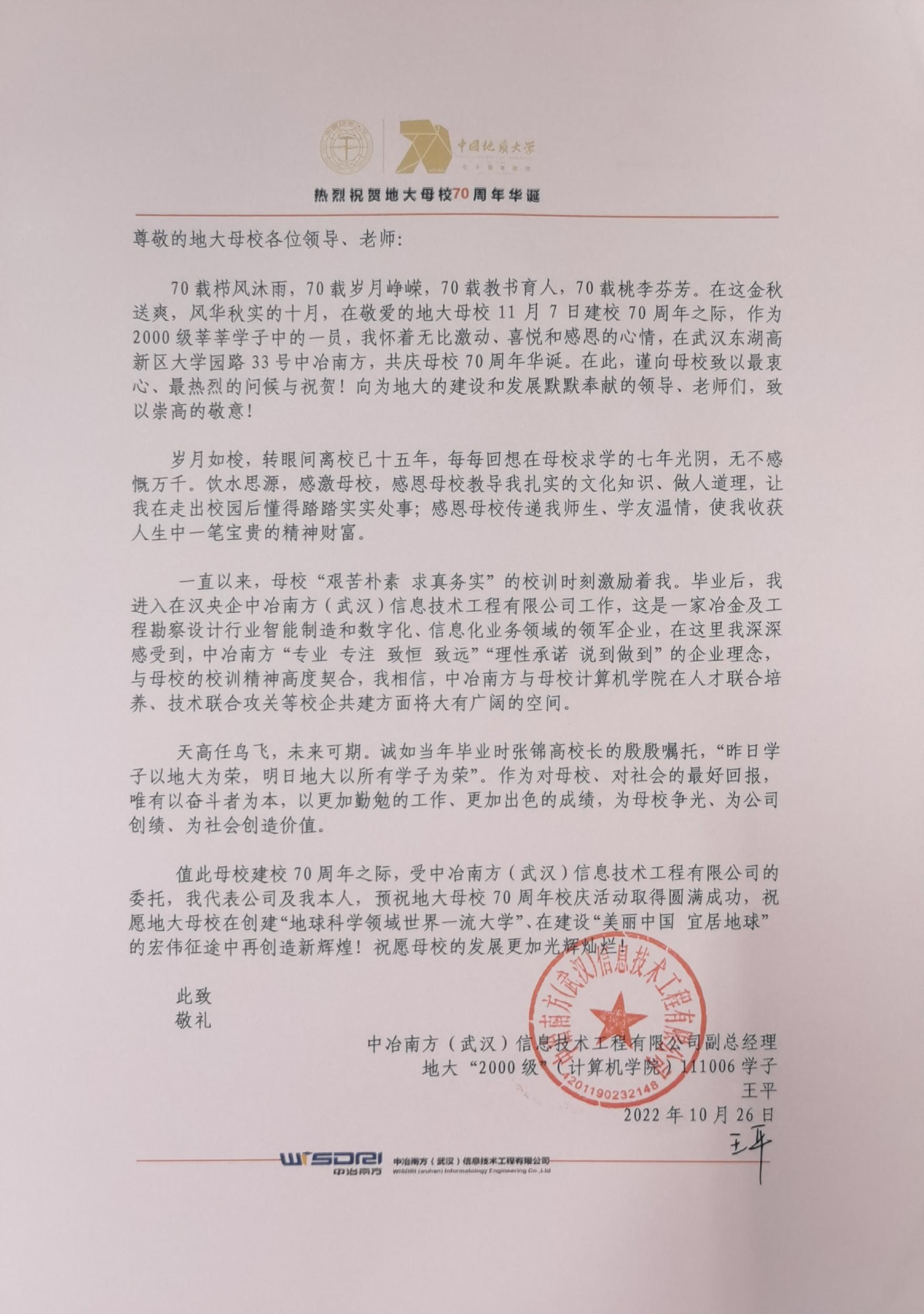 2000级校友王平向母校70周年华诞发来贺信