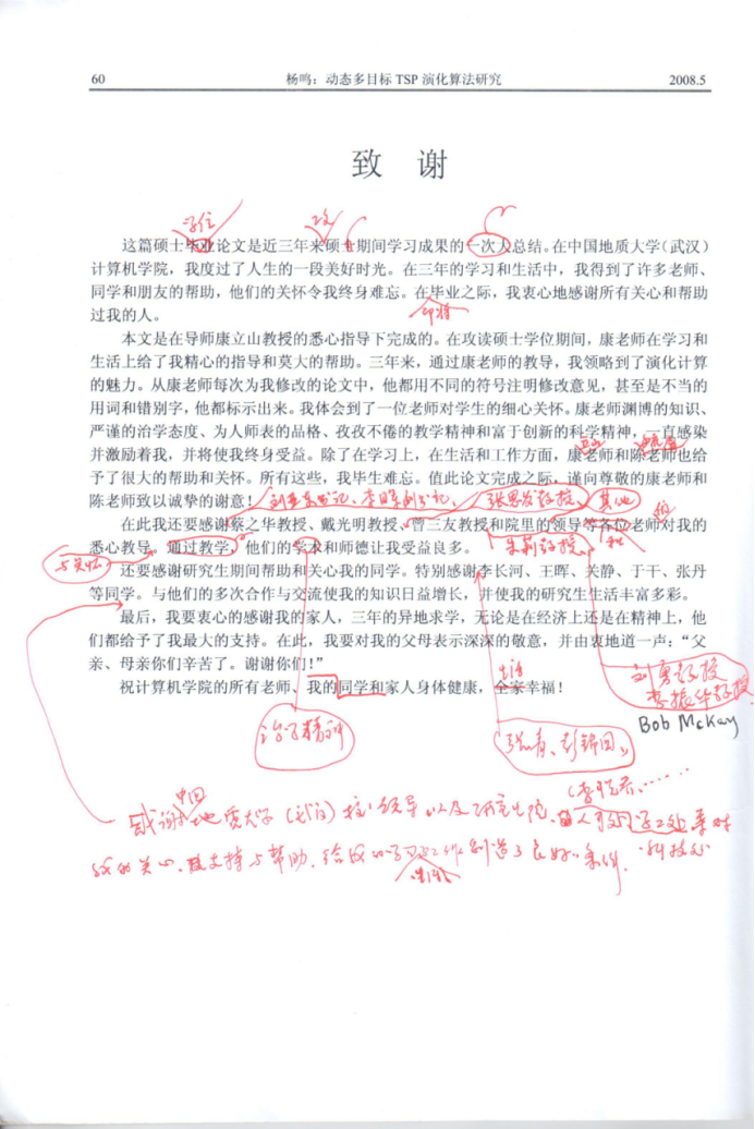 2008年,我完成了硕士毕业论文。我对论文的写作质量非常自信,信心满满地拿给康老师看。当拿到康老师修改后的论文时,我被打击了:康老师的修改意见写得密密麻麻(见图1、2),论文有这么多错误吗?仔细看完修改意见后,我震撼了:所有修改都是合理、准确的。康老师对用词、引用的出处、文字表述等要求准确、严谨,甚至对致谢部分的内容和用词都进行了详细的修改(见图2)。这种严谨、认真的治学,一直是我学习的目标,并且从中受益匪浅。