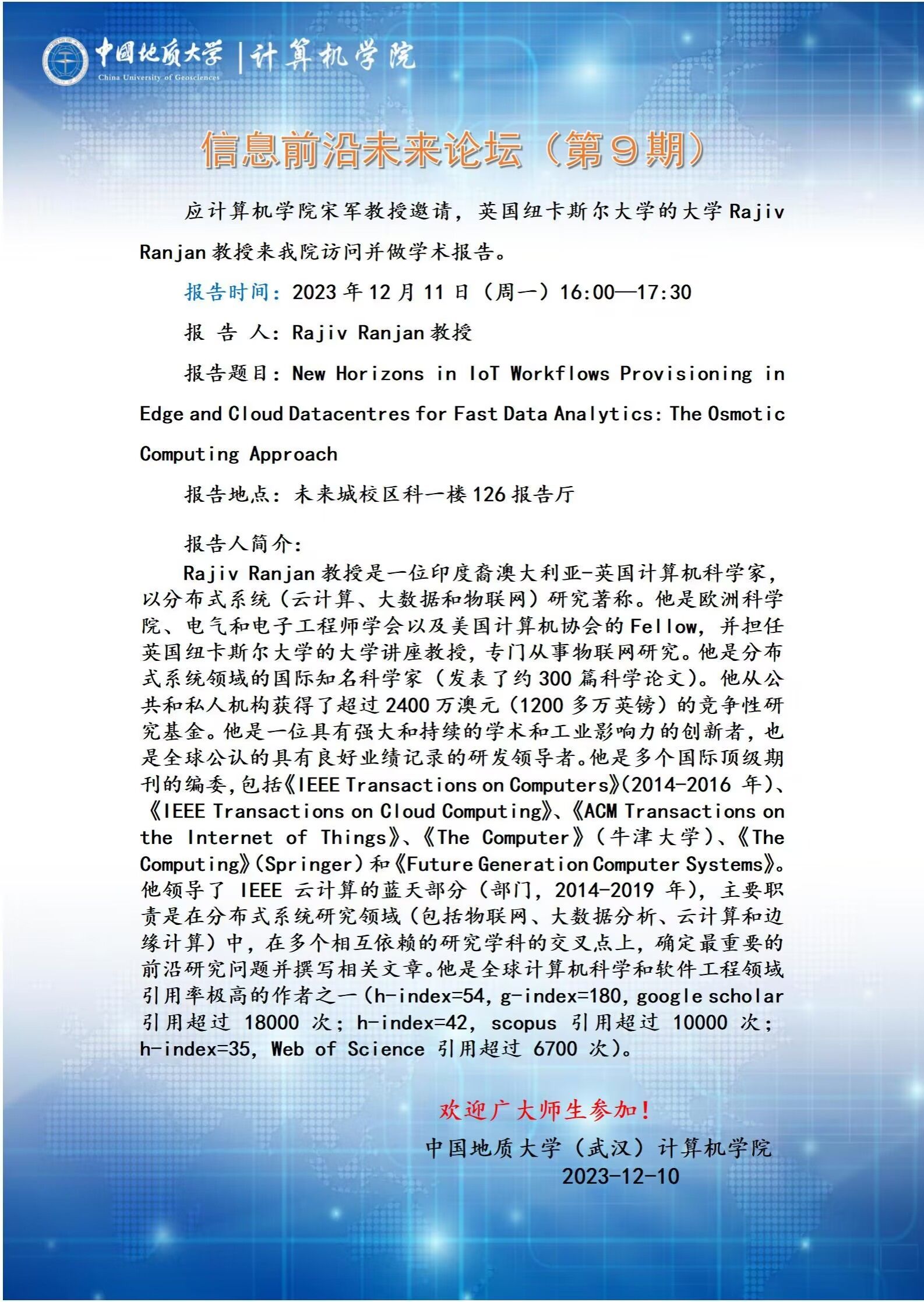 信息前沿未来论坛(第9期):英国纽卡斯尔大学Rajiv Ranjan教授 ——New Horizons in loT Workflows Provisioning in Edge and Cloud Datacentres for Fast Data Analytices:The Osmotic Computing Approach