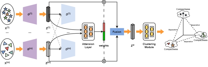 针对上述问题,本研究提出了一个基于交替生成对抗学习策略的多模态表征学习及融合框架(AGARL),该框架旨在通过生成对抗策略来学习多模态数据的潜在共识表征并服务于聚类等下游任务。该模型主要包括三个主要模块:1)基于交替生成对抗学习的各模态表征学习模块:在本研究提出的交替生成对抗学习策略中,来自不同模态的数据将交替作为参照从而确保了学得的各模态的低维表征落在同一潜在的语义空间中进而避免了因不对齐而导致的聚类性能下降;2)跨模态表征融合模块:不同于以往工作中采取的加权平均融合策略,本研究在融合模块中通过类注意力网络使不同模态的度量结构达到相互一致,从而获得了比其他融合策略更好的性能;3)聚类模块:在学得多模态共识的低维潜在表征后,本研究通过基于自监督的子网络进一步学得了更为紧凑的聚类结构划分。